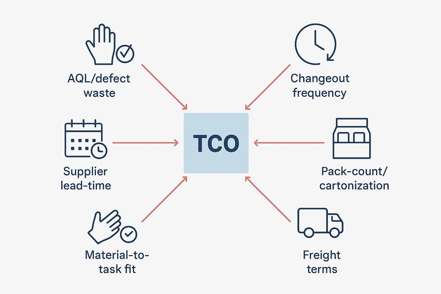 Price per box is easy to quote, but it rarely tells the whole story. Total Cost of Ownership (TCO) includes the costs you incur because gloves fail early, are changed too often, ship inefficiently, or don’t match the task. That’s why two gloves at the same unit price can deliver very different “cost per use.”