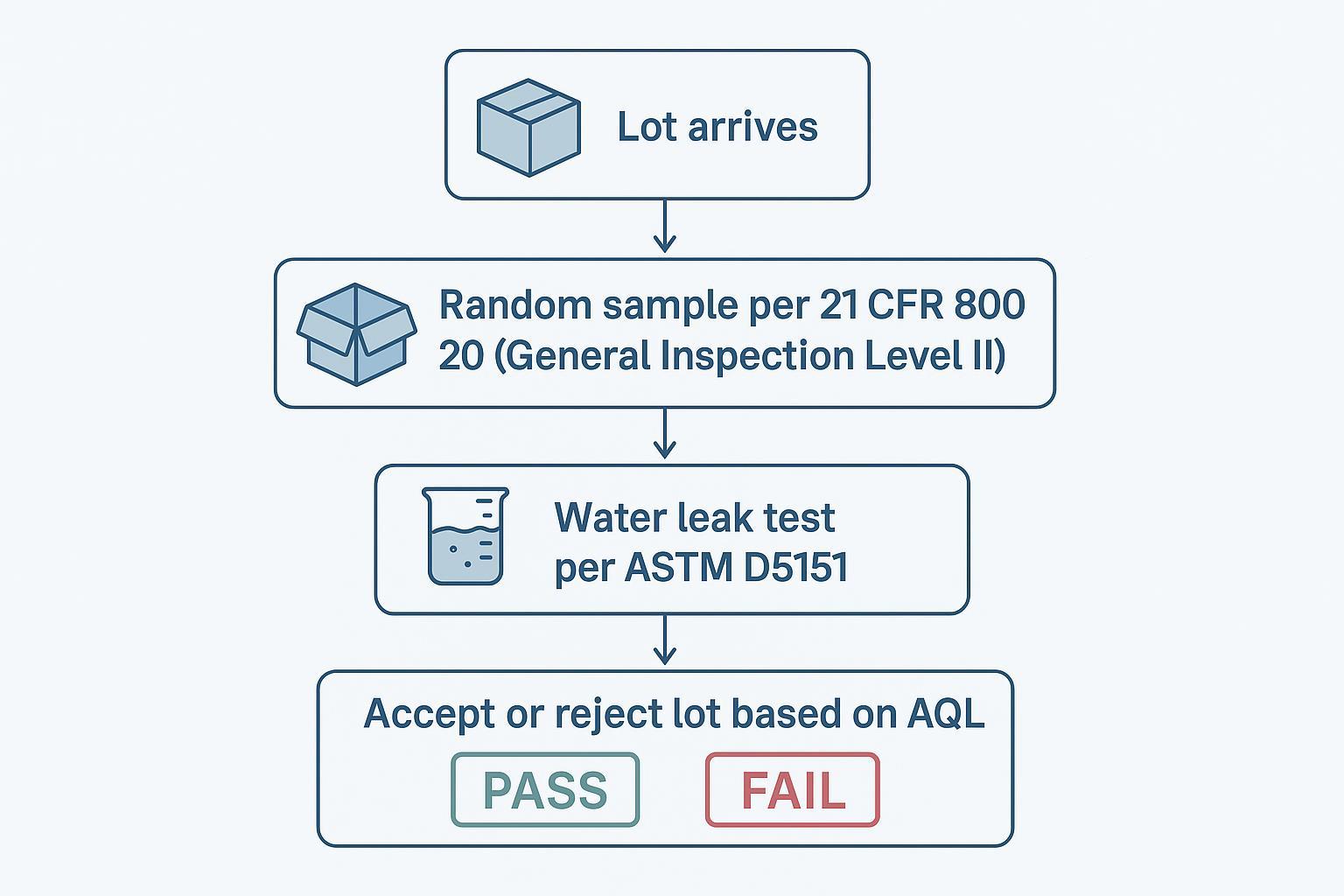 AQL (Acceptable Quality Level) captures the maximum percentage of defective items (e.g., pinholes) expected in a lot. For exam gloves, FDA sampling plans in 21 CFR 800.20 use the ASTM D5151 water‑leak test. If you’re seeing frequent out‑of‑box tears or leaks, you’re paying for waste and rework. Tighten your spec to reflect an AQL appropriate to your risk posture (2.5 is typical for exam gloves) and require vendors to provide quarterly lot performance and any import‑alert notices. Small improvements in incoming quality can unlock outsized savings in high‑volume settings.